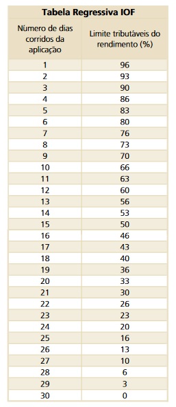Saiba que, além do IRF sobre aplicações, incide também o IOF, se a aplicação for resgatada num prazo inferior a 30 dias. Desta forma, o efeito cumulativo de IRF e IOF faz com que o rendimento líquido “despenque”. Confira adiante a tabela do IOF sobre as aplicações: